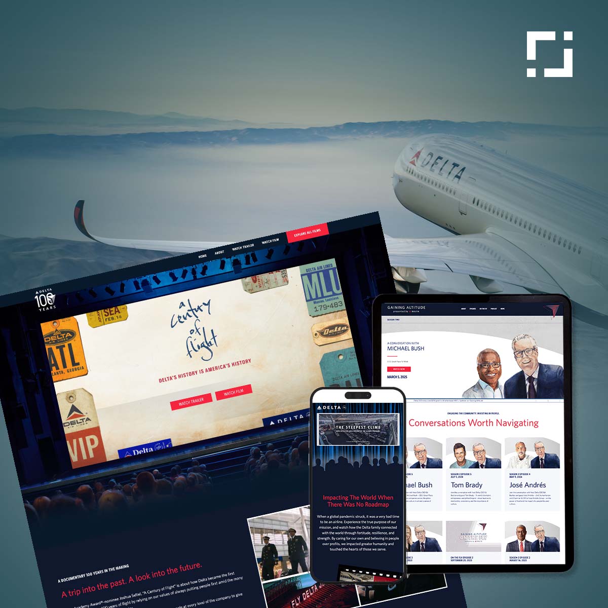 This global multimedia event & video website design engagement encompassed the creation and delivery of three immersive digital experiences: Gaining Altitude, The Steepest Climb, and Century of Flight. For Gaining Altitude, we built an interactive site to support leadership conversations, streaming delivery, and on-demand access to thought-provoking dialogue, enabling users around the world to engage with current and future business insights. (gainingaltitude.delta.com ) For The Steepest Climb, the focus was on showcasing long-form documentary content that chronicles Delta’s resilience and strategic journey, combining cinematic viewing with intuitive online navigation and robust video-on-demand experiences. For Century of Flight, the project highlighted a celebration of Delta’s history by creating a multimedia experience that blends archival storytelling with modern video delivery and site design. Each platform was built for scalability, performance, and cross-device streaming, resulting in compelling online experiences that align with Delta’s global brand and digital expectations.